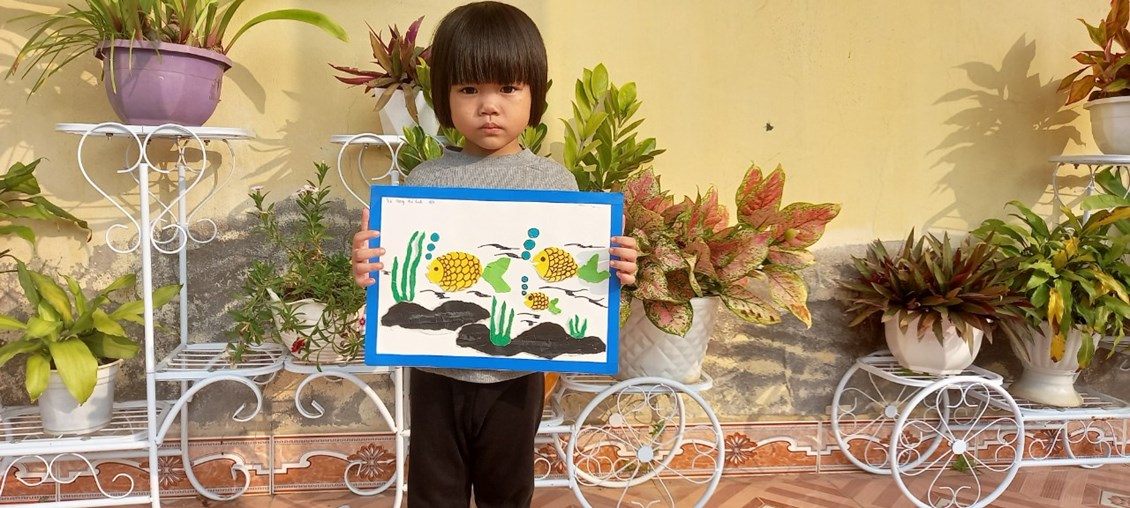 Hình ảnh: Bé Hải Bình với bức tranh "Đàn cá bơi lội"