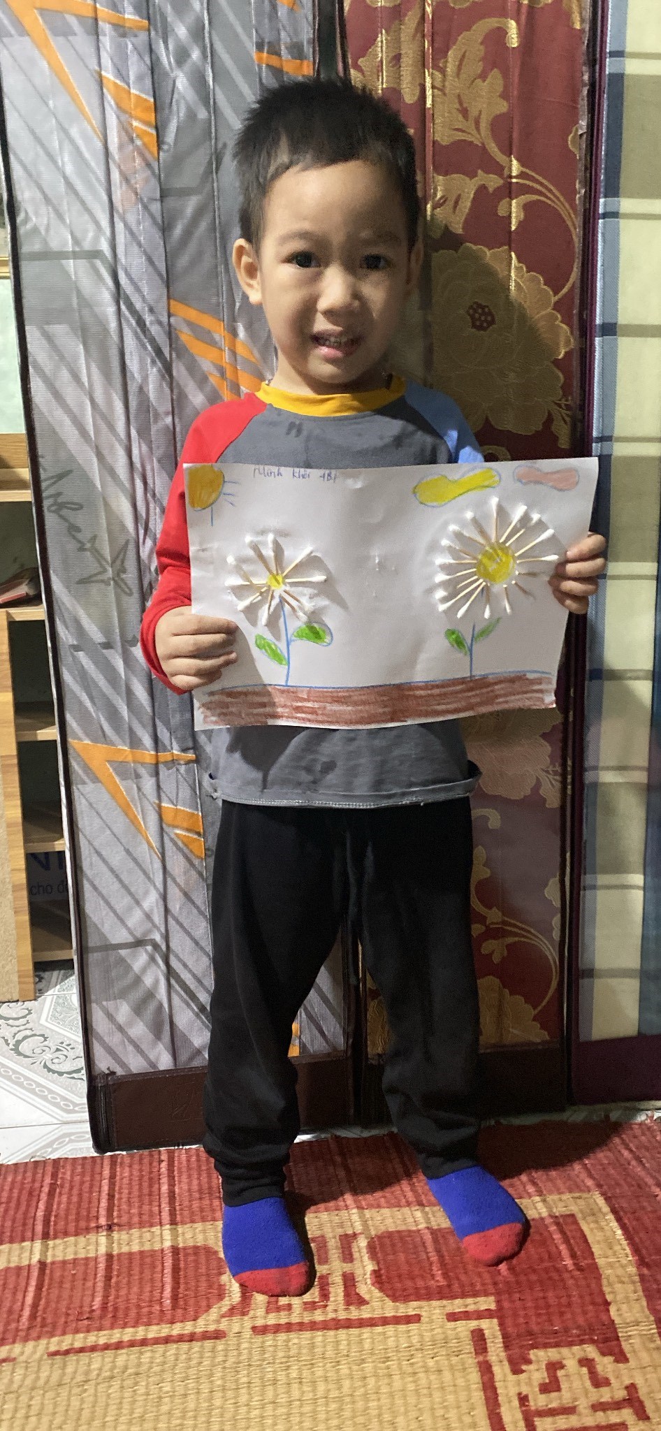 Hình ảnh: Bé Minh Khôi với tranh hoa từ bông tăm