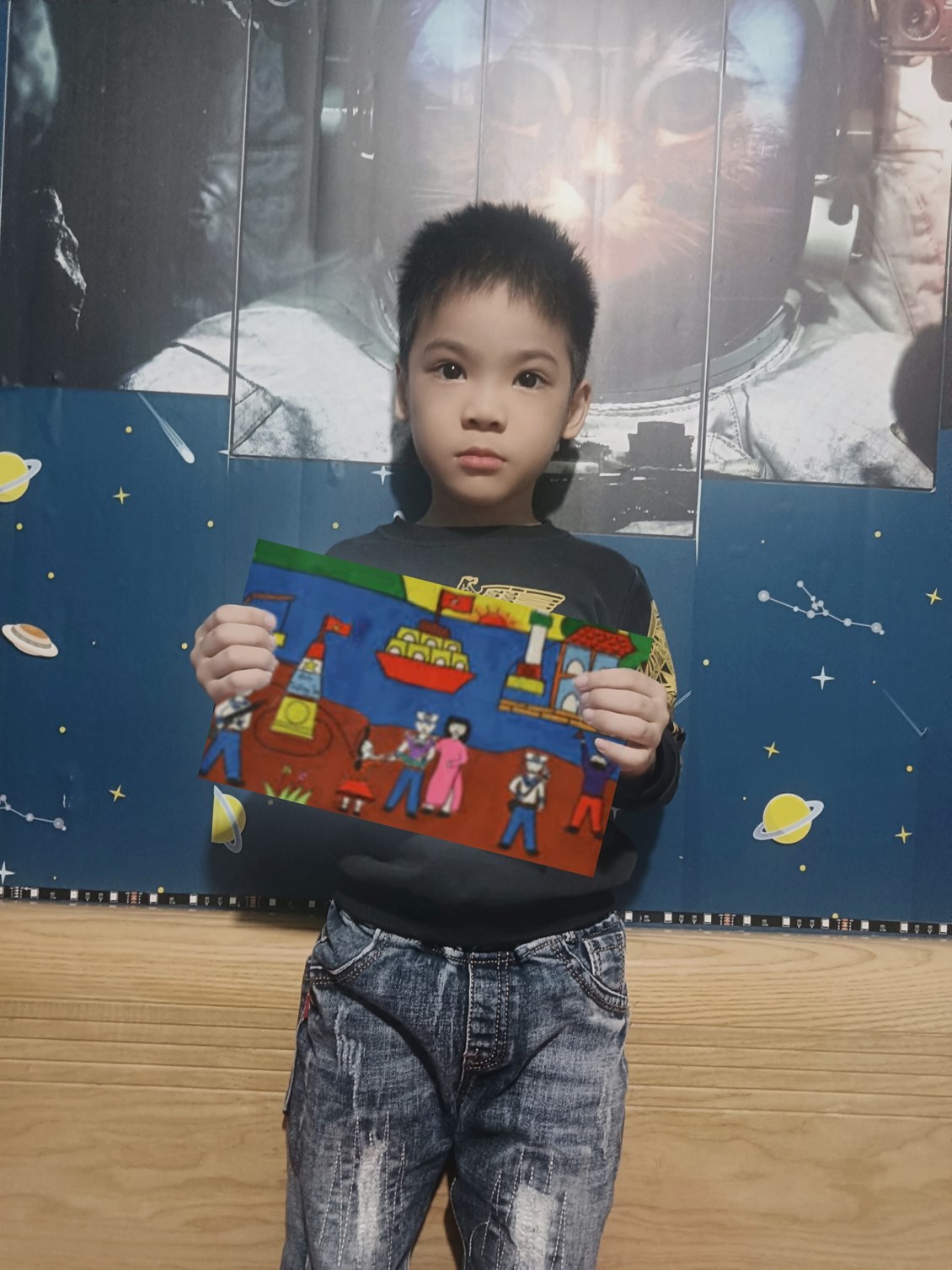 Hình ảnh: Bé Thế Dương với tranh "Ngôi nhà của bé"