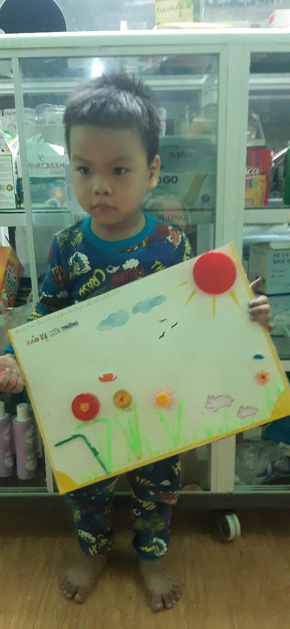 Hình ảnh: Bé Bảo Phúc với bức tranh tái chế "Bảo vệ môi trường"