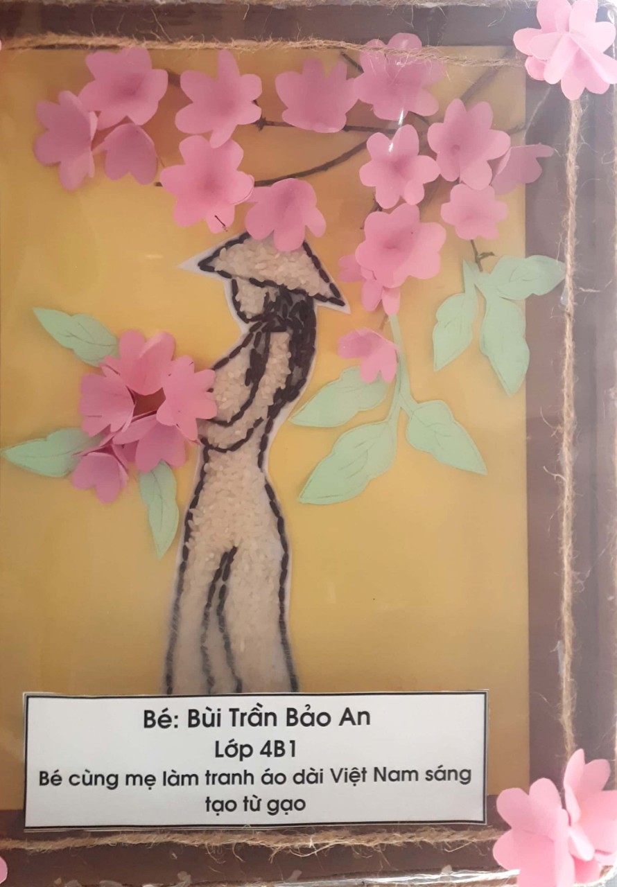 Hình ảnh bé Bùi Trần Bảo An làm tranh cô giáo mắc áo dài nguyên liệu từ gạo
