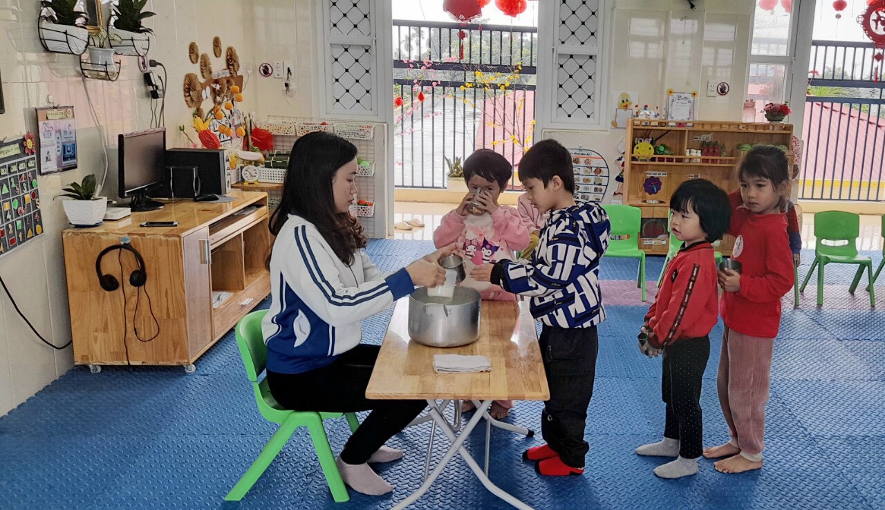 Trẻ rất thích uống sữa và phấn khởi khi được cô giáo gọi lên uống. Trẻ biết xếp hàng lần lượt không chen lấn xô đẩy nhau khi xếp hàng.
