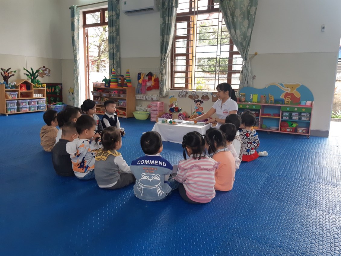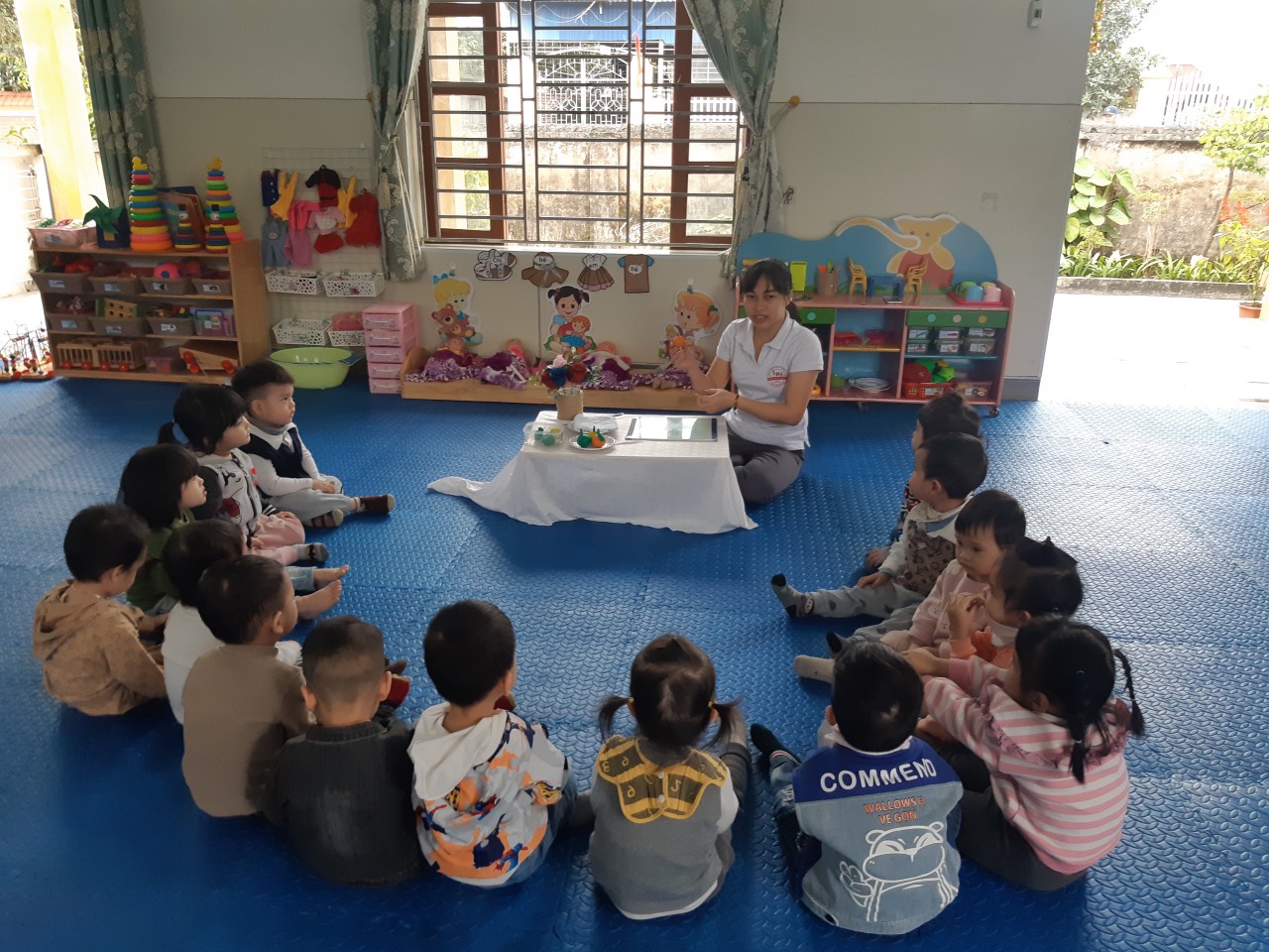 Các bé rất chăm chú nghe cô giới thiệu về quả cam: