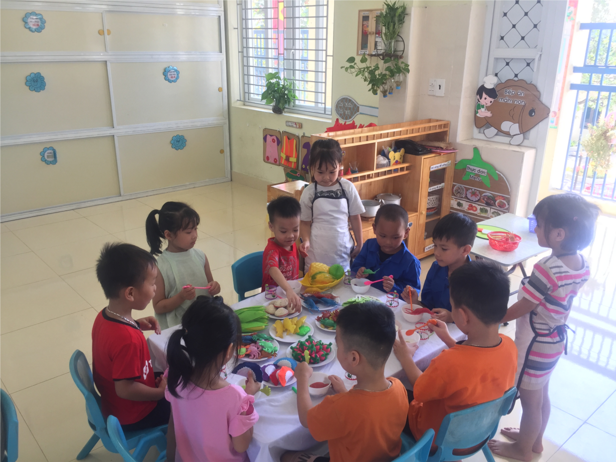 Trẻ đóng vai làm đầu bếp chế biến và bày bàn ăn.