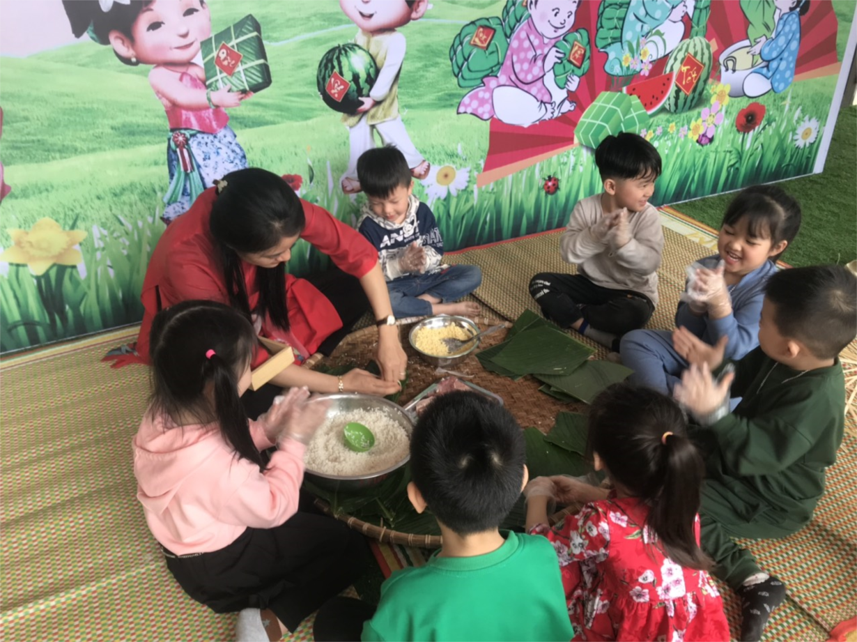 Các bạn lần lượt được trải nghiệm các bước gói bánh trưng dưới sự hướng dẫn của cô giáo. Bạn nào cũng háo hức và mong chờ đến lượt cô giáo hướng dẫn mình gói bánh. Không khí của hoạt động càng trở nên ấm dần khi cái nắng của mùa xuân nhẹ nhàng ghé qua.