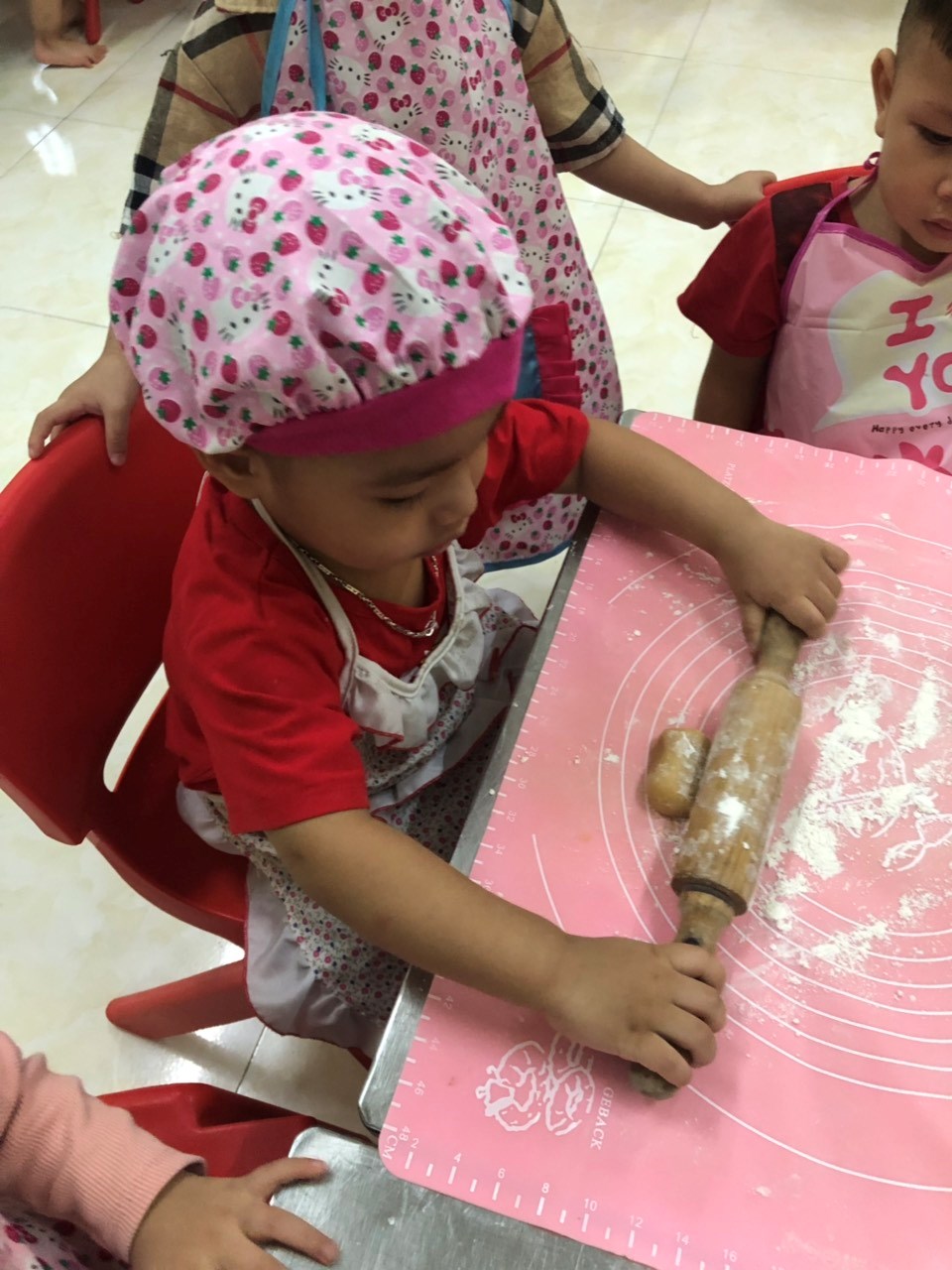 Các bạn nhìn tớ giỏi không nào? Lần đầu tiên tớ được cán bột làm bánh.