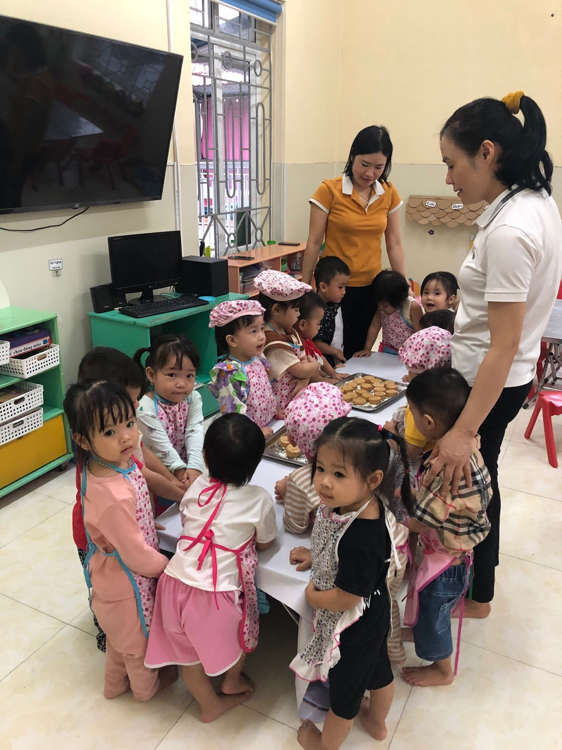 Cô đang hướng dẫn chúng tớ làm bánh, háo hức quá các bạn ạ!