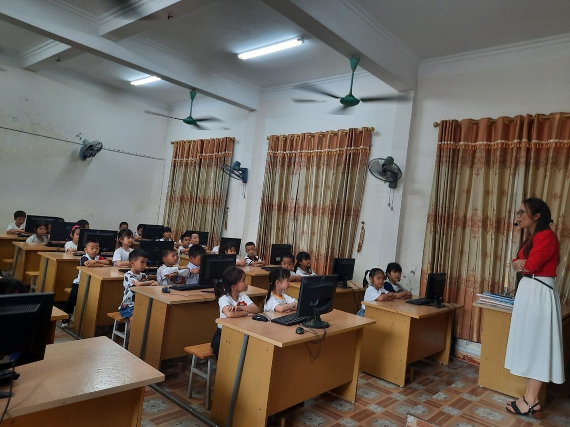 Cô giáo lớp 1 giới thiệu với các bé về phong Tin học của trường.