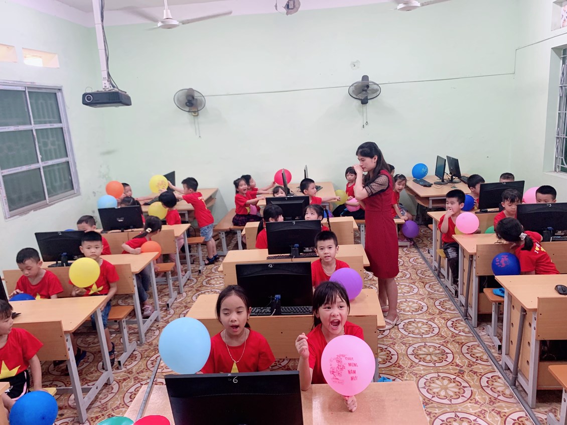 Cô giáo lớp 1 giới thiệu với các bé về phòng Tin học của trường.
