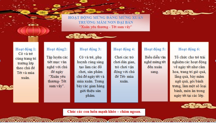 Rất mong nhận được sự quan tâm ủng hộ, phối kết hợp của các bậc phụ huynh để nhà trường và các cô giáo tổ chức tốt các hoạt động với chủ đề ngày “Xuân yêu thương - Tết sum vầy” cho trẻ.