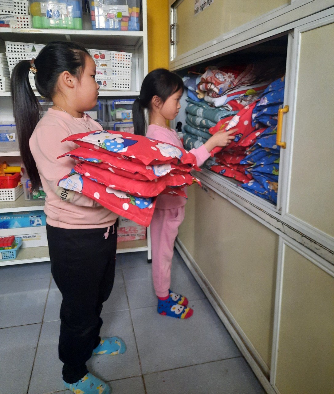 Các bé vệ sinh tủ đồ cá nhân của mình và của bạn, sắp xếp đồ dùng gọn gàng, ngăn nắp.