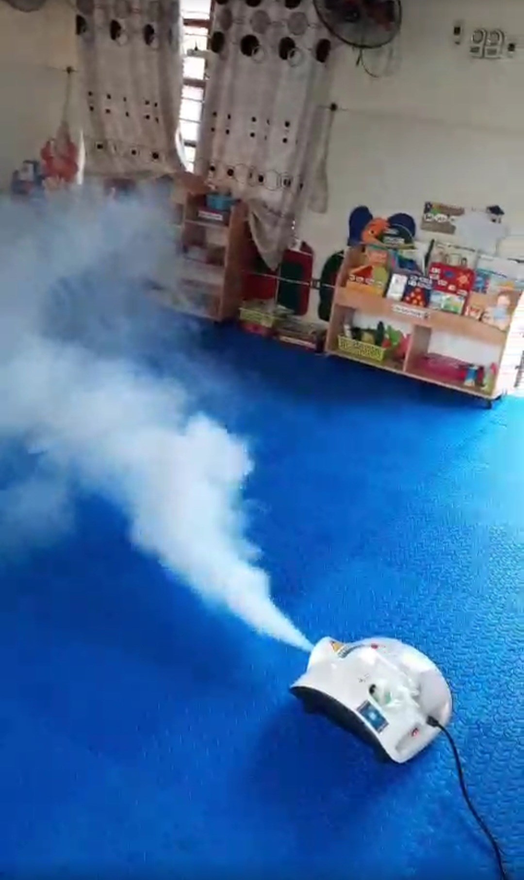 Thực hiện phun khử khuẩn bằng dung dịch Nano bạc, vệ sinh trường lớp sạch sẽ.