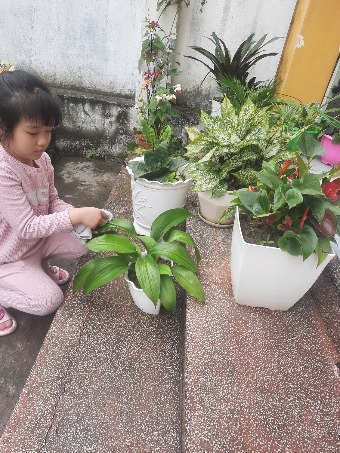 Chăm sóc bồn hoa, cây cảnh ở sân trường cũng như ở lớp học tạo khuôn viên xanh - sạch - đẹp, đảm bảo thân thiện.