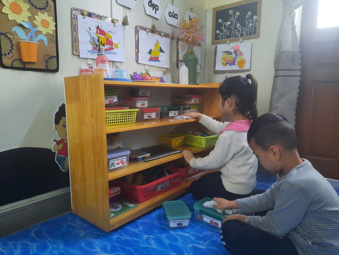 Cô hướng dẫn trẻ lau giá và sắp xếp lại đồ dung đồ chơi, lao động vệ sinh dọn dẹp góc học tập.
