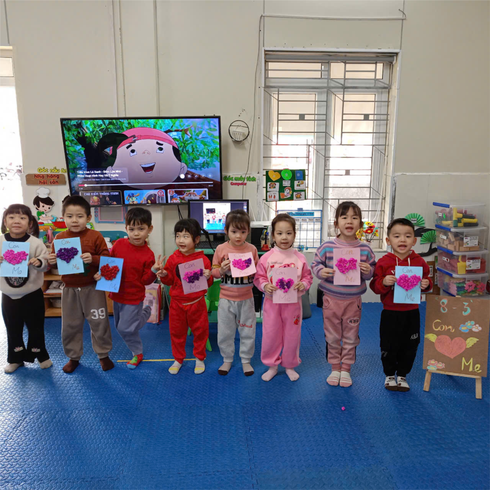 Được sự gợi ý, hướng dẫn của cô giáo, những bàn tay nhỏ nhắn, xinh xinh tỉ mỉ xếp những viên giấy vo rực rỡ tạo hình trái tim yêu thương thay cho lời muốn nói, rồi cẩn thận, nắn nót viết những lời chúc gửi đến bà, đến mẹ và cô giáo của mình.Thật là một món quà ý nghĩa khi chứa đựng tình cảm của các bé thương gửi đến Bà, mẹ và cô giáo trong ngày 8/3. Bé nào cũng phấn khởi vì cảm thấy mình thật tài năng, mình thật khéo tay, dành thật nhiều tình cảm cho những người phụ nữ yêu thương.