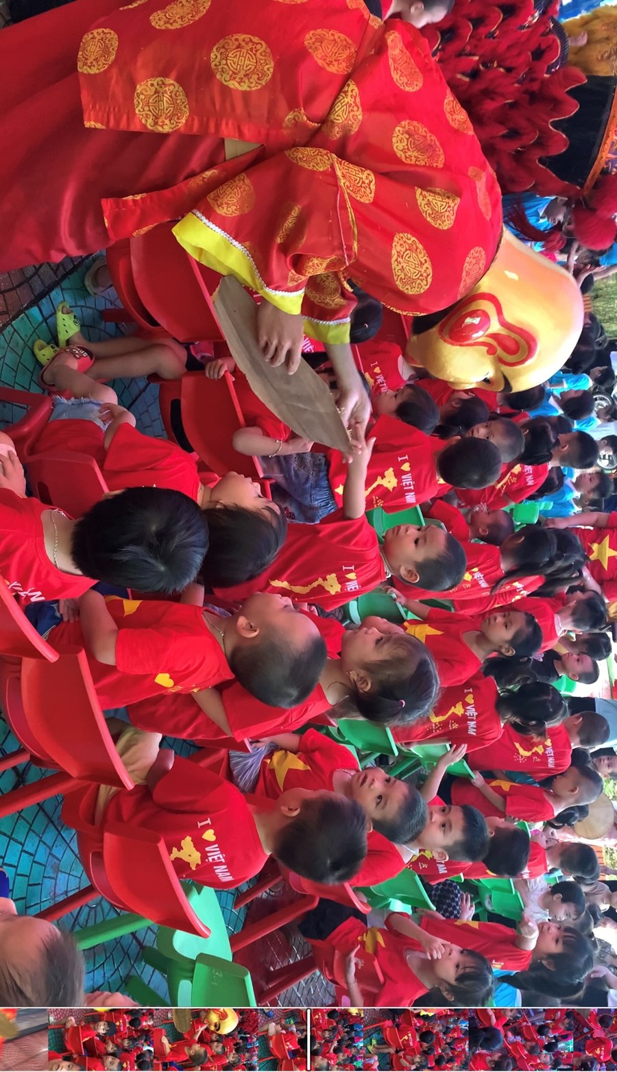 Bé tham gia trò chơi cùng các anh chị lớp lớn, bé cũng cổ vũ cho các anh chị biểu diễn văn nghệ ngày trung thu nữa đấy.