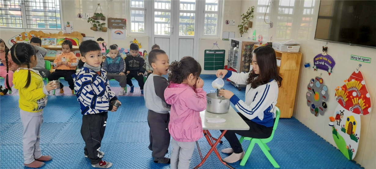 Trẻ ngồi ngay ngắn chờ đến lượt. Khi uống sữa trẻ xin cô và cầm cốc bằng hai tay . Cô có cốc chia vạch để đong sữa cho trẻ với đúng định lượng mà các cô đã tính trong lượng thực đơn trong ngày của trẻ.