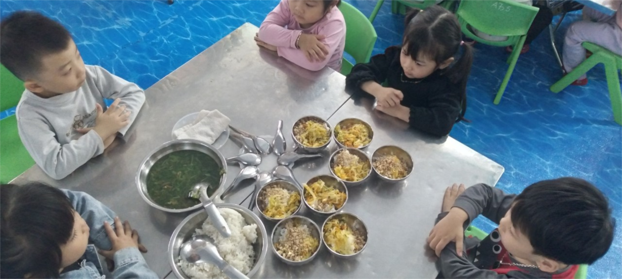 Trước khi vào bàn ăn, các bé vệ sinh rửa tay, rửa mặt. Các bé ngồi vào bàn ngay ngăn. Các cô chuẩn bị đồ ăn cũng như đồ dùng cho các con. Để đảm bảo dinh dưỡng cho các con các cô đã lên thực đơn theo mùa, thực đơn được thay đổi theo từng ngày.
